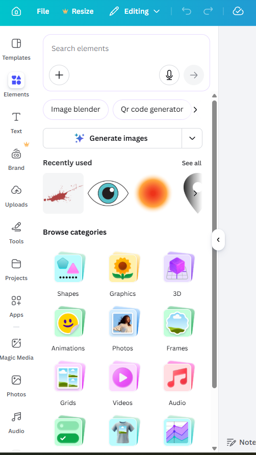 This is where Canva absolutely dominates. The learning curve is almost nonexistent. The toolbar is logically placed. The template library is searchable and well-organised. Drag-and-drop behaves exactly as you’d expect. Color pickers are intuitive. Font pairing works beautifully. Even the more advanced features - like Magic Resize, background removal, and the AI image generator - are accessible through a single panel without digging through menus.
