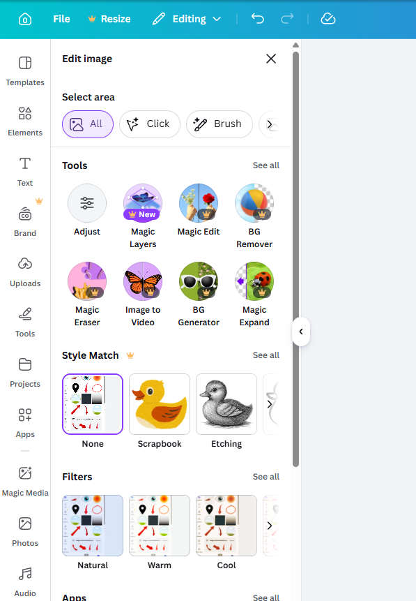 Canva’s photo editing tools have expanded significantly in 2026, and this is where the Affinity acquisition starts to matter. Within the standard Canva editor, you get: brightness/contrast/saturation adjustments, filter presets, background removal (AI-powered, one click), background generation (describe a new background and AI fills it in), blur tools, shadow effects, crop and straighten, and color adjustment by element.