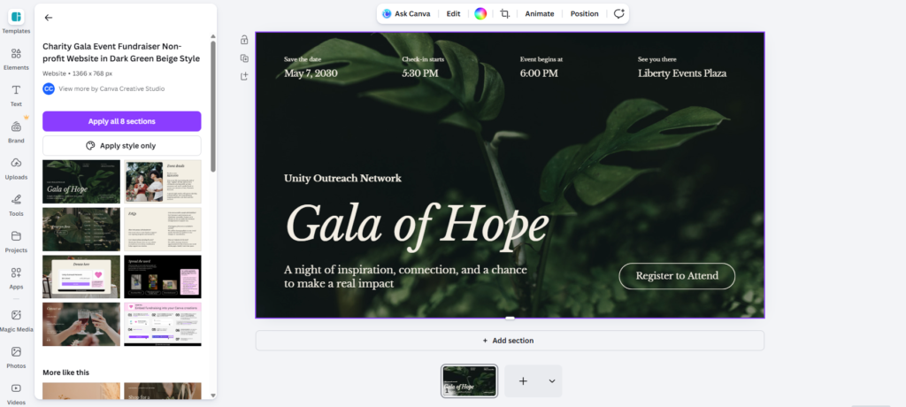 Canva’s website builder is one of the most underrated features in the entire product - and most freelancers have not even touched it. You start with any Canva design and, with one click, can turn it into a multi-page website. The resulting site is responsive, reasonably fast, and fully customisable. You can add navigation, interactive elements, video backgrounds, embedded Canva designs, and - new in 2026 - Canva Code widgets, meaning you can embed fully interactive, AI-generated micro-apps (calculators, quizzes, lead capture tools) directly into your Canva website.