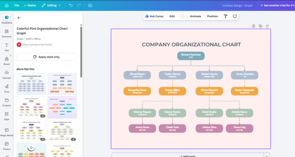 Magic Charts is one of the most genuinely impressive features Canva has shipped in the last 18 months. You paste in data or describe what you want to show, and Canva’s AI selects the appropriate chart type and renders a beautifully styled visualisation that matches your brand in one click. Bar charts, line graphs, pie charts, scatter plots, area charts - all styled and ready to drop into any design or document.