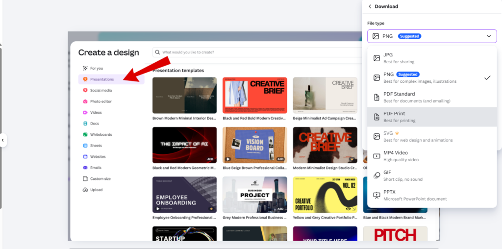 Canva supports: PNG, JPG, PDF (standard and print-ready), SVG, MP4, GIF, PPTX (PowerPoint), and DOCX. SVG export is available on Pro and above - significant for freelancers producing logo work or icon sets. PPTX export is a lifesaver when clients insist on receiving a PowerPoint file they can edit themselves.