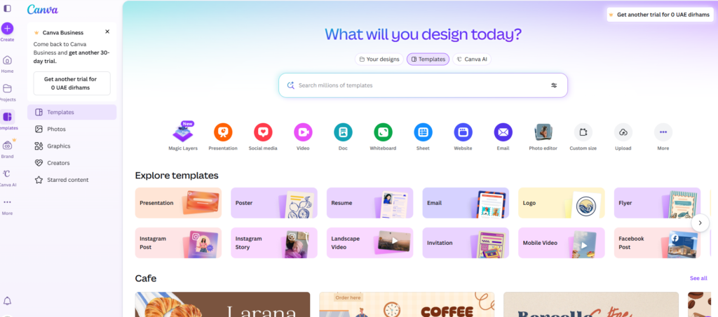 With 3.6 million+ templates available on paid plans (1.6 million on Free), Canva has the largest template library of any design platform by a significant margin. Template quality in 2026 is visually sophisticated, clearly categorised, and searchable by style, industry, color palette, and content type. For freelancers, templates provide both a fast starting point and a source of creative inspiration. Tip: if you create a design system you love for a client, save it as a custom template within their Brand Kit.